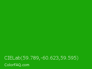 CIELab 59.789,-60.623,59.595 Color is a normal green color and the nearest color is Slimy Green #299617. Hex code #1ba709 and RGB value is rgb(27,167,9). In RGB color space, this color is composed of 11% red, 65% green, 4% blue, In CMYK color space, this color is composed of 84% cyan, 0% magenta, 95% yellow , 35% black , In HSL color space, this color has a hue angle of 113° , 90% saturation and 35% lightness.