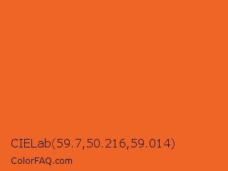 CIELab 59.7,50.216,59.014 Color is a normal orange color and the nearest color is Deep Carrot Orange #e9692c. Hex code #ef6525 and RGB value is rgb(239,101,37). In RGB color space, this color is composed of 94% red, 40% green, 15% blue, In CMYK color space, this color is composed of 0% cyan, 58% magenta, 85% yellow , 6% black , In HSL color space, this color has a hue angle of 19° , 86% saturation and 54% lightness.