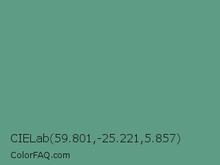 CIELab 59.801,-25.221,5.857 Color is a normal green color and the nearest color is Patina #639a8f. Hex code #5f9c85 and RGB value is rgb(95,156,133). In RGB color space, this color is composed of 37% red, 61% green, 52% blue, In CMYK color space, this color is composed of 39% cyan, 0% magenta, 15% yellow , 39% black , In HSL color space, this color has a hue angle of 157° , 24% saturation and 49% lightness.