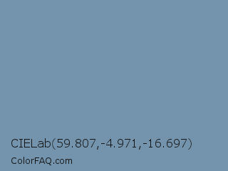CIELab 59.807,-4.971,-16.697 Color is a normal blue color and the nearest color is Weldon Blue #7c98ab. Hex code #7494ad and RGB value is rgb(116,148,173). In RGB color space, this color is composed of 45% red, 58% green, 68% blue, In CMYK color space, this color is composed of 33% cyan, 14% magenta, 0% yellow , 32% black , In HSL color space, this color has a hue angle of 206° , 26% saturation and 57% lightness.