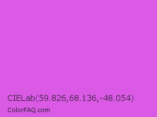 CIELab 59.826,68.136,-48.054 Color is a light magenta color and the nearest color is Orchid #da70d6. Hex code #da5ae6 and RGB value is rgb(218,90,230). In RGB color space, this color is composed of 85% red, 35% green, 90% blue, In CMYK color space, this color is composed of 5% cyan, 61% magenta, 0% yellow , 10% black , In HSL color space, this color has a hue angle of 295° , 74% saturation and 63% lightness.