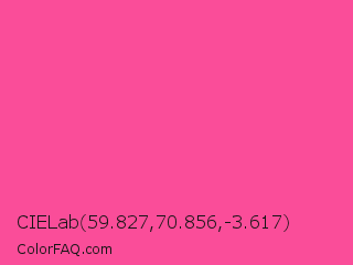 CIELab 59.827,70.856,-3.617 Color is a light rose color and the nearest color is Violet Red #f75394. Hex code #fa4d99 and RGB value is rgb(250,77,153). In RGB color space, this color is composed of 98% red, 30% green, 60% blue, In CMYK color space, this color is composed of 0% cyan, 69% magenta, 39% yellow , 2% black , In HSL color space, this color has a hue angle of 334° , 95% saturation and 64% lightness.