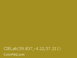 CIELab 59.837,-4.22,57.211 Color is a normal yellow color and the nearest color is Luxor Gold #a7882c. Hex code #a49020 and RGB value is rgb(164,144,32). In RGB color space, this color is composed of 64% red, 56% green, 13% blue, In CMYK color space, this color is composed of 0% cyan, 12% magenta, 80% yellow , 36% black , In HSL color space, this color has a hue angle of 51° , 67% saturation and 38% lightness.