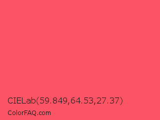 CIELab 59.849,64.53,27.37 Color is a light red color and the nearest color is Carnation #f95a61. Hex code #fc5464 and RGB value is rgb(252,84,100). In RGB color space, this color is composed of 99% red, 33% green, 39% blue, In CMYK color space, this color is composed of 0% cyan, 67% magenta, 60% yellow , 1% black , In HSL color space, this color has a hue angle of 354° , 97% saturation and 66% lightness.