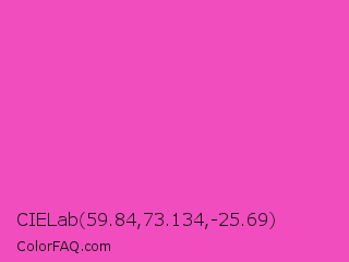 CIELab 59.84,73.134,-25.69 Color is a light magenta color and the nearest color is Light Deep Pink #ff5ccd. Hex code #f24dbf and RGB value is rgb(242,77,191). In RGB color space, this color is composed of 95% red, 30% green, 75% blue, In CMYK color space, this color is composed of 0% cyan, 68% magenta, 21% yellow , 5% black , In HSL color space, this color has a hue angle of 319° , 86% saturation and 63% lightness.
