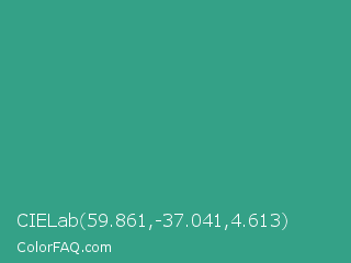 CIELab 59.861,-37.041,4.613 Color is a normal cyan color and the nearest color is Zomp #39a78e. Hex code #34a187 and RGB value is rgb(52,161,135). In RGB color space, this color is composed of 20% red, 63% green, 53% blue, In CMYK color space, this color is composed of 68% cyan, 0% magenta, 16% yellow , 37% black , In HSL color space, this color has a hue angle of 166° , 51% saturation and 42% lightness.