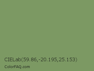 CIELab 59.86,-20.195,25.153 Color is a normal green color and the nearest color is Asparagus Green #7ba05b. Hex code #7c9963 and RGB value is rgb(124,153,99). In RGB color space, this color is composed of 49% red, 60% green, 39% blue, In CMYK color space, this color is composed of 19% cyan, 0% magenta, 35% yellow , 40% black , In HSL color space, this color has a hue angle of 92° , 21% saturation and 49% lightness.