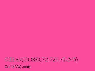 CIELab 59.883,72.729,-5.245 Color is a light rose color and the nearest color is Rose Bonbon #f9429e. Hex code #fc4a9c and RGB value is rgb(252,74,156). In RGB color space, this color is composed of 99% red, 29% green, 61% blue, In CMYK color space, this color is composed of 0% cyan, 71% magenta, 38% yellow , 1% black , In HSL color space, this color has a hue angle of 332° , 97% saturation and 64% lightness.