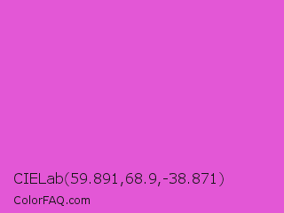 CIELab 59.891,68.9,-38.871 Color is a light magenta color and the nearest color is Orchid #da70d6. Hex code #e357d6 and RGB value is rgb(227,87,214). In RGB color space, this color is composed of 89% red, 34% green, 84% blue, In CMYK color space, this color is composed of 0% cyan, 62% magenta, 6% yellow , 11% black , In HSL color space, this color has a hue angle of 306° , 71% saturation and 62% lightness.