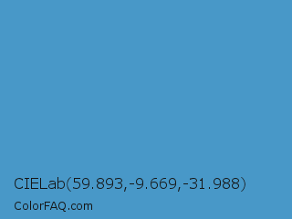CIELab 59.893,-9.669,-31.988 Color is a normal blue color and the nearest color is Celestial Blue #4997d0. Hex code #4898c8 and RGB value is rgb(72,152,200). In RGB color space, this color is composed of 28% red, 60% green, 78% blue, In CMYK color space, this color is composed of 64% cyan, 24% magenta, 0% yellow , 22% black , In HSL color space, this color has a hue angle of 203° , 54% saturation and 53% lightness.