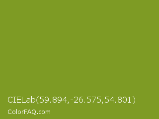 CIELab 59.894,-26.575,54.801 Color is a normal lime color and the nearest color is Wasabi #788a25. Hex code #7e9b24 and RGB value is rgb(126,155,36). In RGB color space, this color is composed of 49% red, 61% green, 14% blue, In CMYK color space, this color is composed of 19% cyan, 0% magenta, 77% yellow , 39% black , In HSL color space, this color has a hue angle of 75° , 62% saturation and 37% lightness.