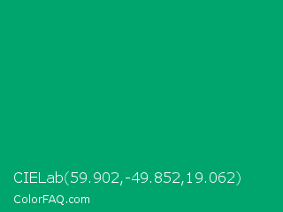 CIELab 59.902,-49.852,19.062 Color is a normal green color and the nearest color is Jade #00a86b. Hex code #00a56d and RGB value is rgb(0,165,109). In RGB color space, this color is composed of 0% red, 65% green, 43% blue, In CMYK color space, this color is composed of 100% cyan, 0% magenta, 34% yellow , 35% black , In HSL color space, this color has a hue angle of 160° , 100% saturation and 32% lightness.