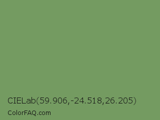 CIELab 59.906,-24.518,26.205 Color is a normal green color and the nearest color is Asparagus Green #7ba05b. Hex code #749b61 and RGB value is rgb(116,155,97). In RGB color space, this color is composed of 45% red, 61% green, 38% blue, In CMYK color space, this color is composed of 25% cyan, 0% magenta, 37% yellow , 39% black , In HSL color space, this color has a hue angle of 100° , 23% saturation and 49% lightness.