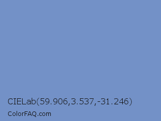 CIELab 59.906,3.537,-31.246 Color is a light blue color and the nearest color is Cerulean Frost #6d9bc3. Hex code #7391c7 and RGB value is rgb(115,145,199). In RGB color space, this color is composed of 45% red, 57% green, 78% blue, In CMYK color space, this color is composed of 42% cyan, 27% magenta, 0% yellow , 22% black , In HSL color space, this color has a hue angle of 219° , 43% saturation and 62% lightness.