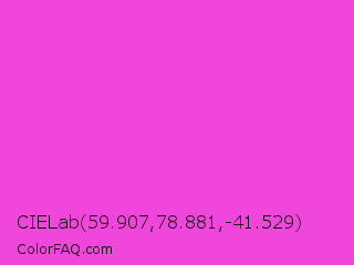 CIELab 59.907,78.881,-41.529 Color is a light magenta color and the nearest color is Purple Pizzazz #fe4eda. Hex code #f046db and RGB value is rgb(240,70,219). In RGB color space, this color is composed of 94% red, 27% green, 86% blue, In CMYK color space, this color is composed of 0% cyan, 71% magenta, 9% yellow , 6% black , In HSL color space, this color has a hue angle of 307° , 85% saturation and 61% lightness.