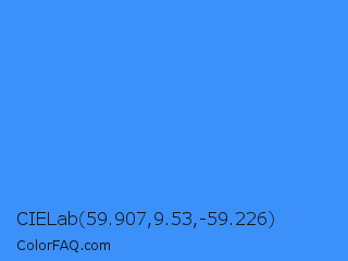CIELab 59.907,9.53,-59.226 Color is a normal blue color and the nearest color is Brilliant Azure #3399ff. Hex code #3b91f9 and RGB value is rgb(59,145,249). In RGB color space, this color is composed of 23% red, 57% green, 98% blue, In CMYK color space, this color is composed of 76% cyan, 42% magenta, 0% yellow , 2% black , In HSL color space, this color has a hue angle of 213° , 94% saturation and 60% lightness.