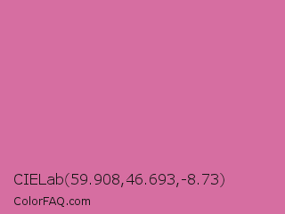 CIELab 59.908,46.693,-8.73 Color is a light rose color and the nearest color is Wild Orchid #d470a2. Hex code #d66ea1 and RGB value is rgb(214,110,161). In RGB color space, this color is composed of 84% red, 43% green, 63% blue, In CMYK color space, this color is composed of 0% cyan, 49% magenta, 25% yellow , 16% black , In HSL color space, this color has a hue angle of 331° , 56% saturation and 64% lightness.