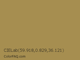 CIELab 59.918,0.829,36.121 Color is a normal orange color and the nearest color is Limed Oak #ac8a56. Hex code #a68e50 and RGB value is rgb(166,142,80). In RGB color space, this color is composed of 65% red, 56% green, 31% blue, In CMYK color space, this color is composed of 0% cyan, 14% magenta, 52% yellow , 35% black , In HSL color space, this color has a hue angle of 43° , 35% saturation and 48% lightness.