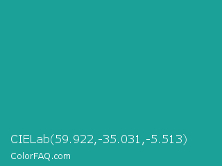 CIELab 59.922,-35.031,-5.513 Color is a normal cyan color and the nearest color is Eastern Blue #1e9ab0. Hex code #1ca199 and RGB value is rgb(28,161,153). In RGB color space, this color is composed of 11% red, 63% green, 60% blue, In CMYK color space, this color is composed of 83% cyan, 0% magenta, 5% yellow , 37% black , In HSL color space, this color has a hue angle of 176° , 70% saturation and 37% lightness.