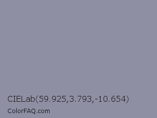 CIELab 59.925,3.793,-10.654 Color is a normal blue color and the nearest color is Manatee Crayola #8d90a1. Hex code #8e8fa3 and RGB value is rgb(142,143,163). In RGB color space, this color is composed of 56% red, 56% green, 64% blue, In CMYK color space, this color is composed of 13% cyan, 12% magenta, 0% yellow , 36% black , In HSL color space, this color has a hue angle of 237° , 10% saturation and 60% lightness.