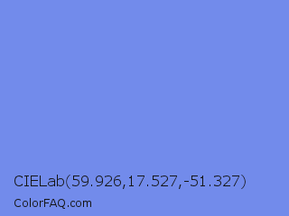 CIELab 59.926,17.527,-51.327 Color is a light blue color and the nearest color is Cornflower Blue #6495ed. Hex code #728beb and RGB value is rgb(114,139,235). In RGB color space, this color is composed of 45% red, 55% green, 92% blue, In CMYK color space, this color is composed of 51% cyan, 41% magenta, 0% yellow , 8% black , In HSL color space, this color has a hue angle of 228° , 75% saturation and 68% lightness.