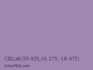 CIELab 59.935,16.275,-18.475 Color is a light purple color and the nearest color is Lavender Purple #967bb6. Hex code #9e88b1 and RGB value is rgb(158,136,177). In RGB color space, this color is composed of 62% red, 53% green, 69% blue, In CMYK color space, this color is composed of 11% cyan, 23% magenta, 0% yellow , 31% black , In HSL color space, this color has a hue angle of 272° , 21% saturation and 61% lightness.
