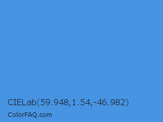 CIELab 59.948,1.54,-46.982 Color is a normal blue color and the nearest color is Tufts Blue #3e8ede. Hex code #4794e3 and RGB value is rgb(71,148,227). In RGB color space, this color is composed of 28% red, 58% green, 89% blue, In CMYK color space, this color is composed of 69% cyan, 35% magenta, 0% yellow , 11% black , In HSL color space, this color has a hue angle of 210° , 74% saturation and 58% lightness.