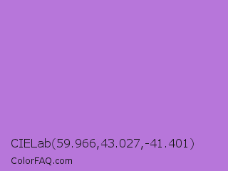 CIELab 59.966,43.027,-41.401 Color is a light purple color and the nearest color is Lavender #b57edc. Hex code #b776da and RGB value is rgb(183,118,218). In RGB color space, this color is composed of 72% red, 46% green, 85% blue, In CMYK color space, this color is composed of 16% cyan, 46% magenta, 0% yellow , 15% black , In HSL color space, this color has a hue angle of 279° , 57% saturation and 66% lightness.