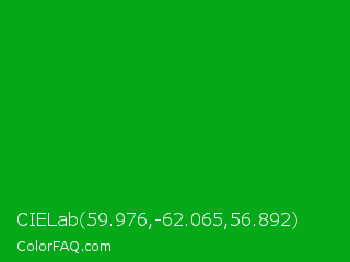 CIELab 59.976,-62.065,56.892 Color is a normal green color and the nearest color is Islamic Green #009000. Hex code #04a818 and RGB value is rgb(4,168,24). In RGB color space, this color is composed of 2% red, 66% green, 9% blue, In CMYK color space, this color is composed of 98% cyan, 0% magenta, 86% yellow , 34% black , In HSL color space, this color has a hue angle of 127° , 95% saturation and 34% lightness.
