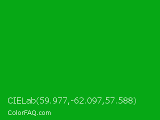 CIELab 59.977,-62.097,57.588 Color is a normal green color and the nearest color is Islamic Green #009000. Hex code #06a815 and RGB value is rgb(6,168,21). In RGB color space, this color is composed of 2% red, 66% green, 8% blue, In CMYK color space, this color is composed of 96% cyan, 0% magenta, 88% yellow , 34% black , In HSL color space, this color has a hue angle of 126° , 93% saturation and 34% lightness.