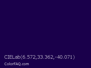 CIELab 6.572,33.362,-40.071 Color is a very dark violet color and the nearest color is Tolopea #1b0245. Hex code #1a004b and RGB value is rgb(26,0,75). In RGB color space, this color is composed of 10% red, 0% green, 29% blue, In CMYK color space, this color is composed of 65% cyan, 100% magenta, 0% yellow , 71% black , In HSL color space, this color has a hue angle of 261° , 100% saturation and 15% lightness.