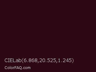 CIELab 6.868,20.525,1.245 Color is a very dark rose color and the nearest color is Coffee Bean #2a140e. Hex code #2d0714 and RGB value is rgb(45,7,20). In RGB color space, this color is composed of 18% red, 3% green, 8% blue, In CMYK color space, this color is composed of 0% cyan, 84% magenta, 56% yellow , 82% black , In HSL color space, this color has a hue angle of 339° , 73% saturation and 10% lightness.
