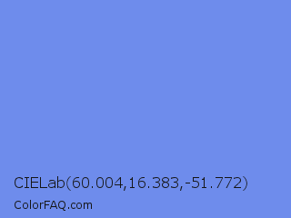 CIELab 60.004,16.383,-51.772 Color is a light blue color and the nearest color is Cornflower Blue #6495ed. Hex code #6e8cec and RGB value is rgb(110,140,236). In RGB color space, this color is composed of 43% red, 55% green, 93% blue, In CMYK color space, this color is composed of 53% cyan, 41% magenta, 0% yellow , 7% black , In HSL color space, this color has a hue angle of 226° , 77% saturation and 68% lightness.