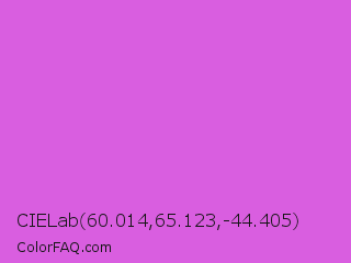 CIELab 60.014,65.123,-44.405 Color is a light magenta color and the nearest color is Orchid #da70d6. Hex code #d95ee0 and RGB value is rgb(217,94,224). In RGB color space, this color is composed of 85% red, 37% green, 88% blue, In CMYK color space, this color is composed of 3% cyan, 58% magenta, 0% yellow , 12% black , In HSL color space, this color has a hue angle of 297° , 68% saturation and 62% lightness.
