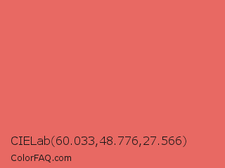 CIELab 60.033,48.776,27.566 Color is a light red color and the nearest color is Sunglo #e16865. Hex code #e86963 and RGB value is rgb(232,105,99). In RGB color space, this color is composed of 91% red, 41% green, 39% blue, In CMYK color space, this color is composed of 0% cyan, 55% magenta, 57% yellow , 9% black , In HSL color space, this color has a hue angle of 3° , 74% saturation and 65% lightness.