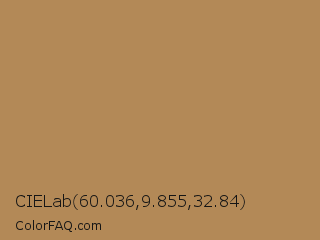 CIELab 60.036,9.855,32.84 Color is a normal orange color and the nearest color is Limed Oak #ac8a56. Hex code #b38957 and RGB value is rgb(179,137,87). In RGB color space, this color is composed of 70% red, 54% green, 34% blue, In CMYK color space, this color is composed of 0% cyan, 23% magenta, 51% yellow , 30% black , In HSL color space, this color has a hue angle of 33° , 38% saturation and 52% lightness.
