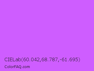 CIELab 60.042,68.787,-61.695 Color is a light purple color and the nearest color is Heliotrope #df73ff. Hex code #ce5dff and RGB value is rgb(206,93,255). In RGB color space, this color is composed of 81% red, 36% green, 100% blue, In CMYK color space, this color is composed of 19% cyan, 64% magenta, 0% yellow , 0% black , In HSL color space, this color has a hue angle of 282° , 100% saturation and 68% lightness.