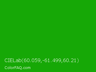 CIELab 60.059,-61.499,60.21 Color is a normal green color and the nearest color is Slimy Green #299617. Hex code #16a806 and RGB value is rgb(22,168,6). In RGB color space, this color is composed of 9% red, 66% green, 2% blue, In CMYK color space, this color is composed of 87% cyan, 0% magenta, 96% yellow , 34% black , In HSL color space, this color has a hue angle of 114° , 93% saturation and 34% lightness.