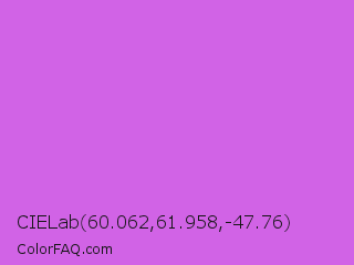 CIELab 60.062,61.958,-47.76 Color is a light purple color and the nearest color is Orchid #da70d6. Hex code #d163e6 and RGB value is rgb(209,99,230). In RGB color space, this color is composed of 82% red, 39% green, 90% blue, In CMYK color space, this color is composed of 9% cyan, 57% magenta, 0% yellow , 10% black , In HSL color space, this color has a hue angle of 290° , 72% saturation and 65% lightness.