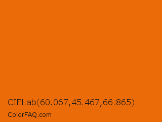 CIELab 60.067,45.467,66.865 Color is a normal orange color and the nearest color is Christine #e7730a. Hex code #eb6b09 and RGB value is rgb(235,107,9). In RGB color space, this color is composed of 92% red, 42% green, 4% blue, In CMYK color space, this color is composed of 0% cyan, 54% magenta, 96% yellow , 8% black , In HSL color space, this color has a hue angle of 26° , 93% saturation and 48% lightness.