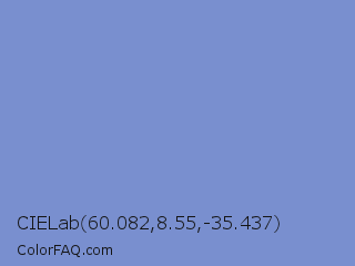 CIELab 60.082,8.55,-35.437 Color is a light blue color and the nearest color is Dark Pastel Blue #779ecb. Hex code #798fcf and RGB value is rgb(121,143,207). In RGB color space, this color is composed of 47% red, 56% green, 81% blue, In CMYK color space, this color is composed of 42% cyan, 31% magenta, 0% yellow , 19% black , In HSL color space, this color has a hue angle of 225° , 47% saturation and 64% lightness.