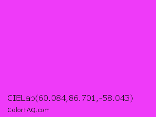 CIELab 60.084,86.701,-58.043 Color is a normal magenta color and the nearest color is Purple Pizzazz #fe4eda. Hex code #ef3af9 and RGB value is rgb(239,58,249). In RGB color space, this color is composed of 94% red, 23% green, 98% blue, In CMYK color space, this color is composed of 4% cyan, 77% magenta, 0% yellow , 2% black , In HSL color space, this color has a hue angle of 297° , 94% saturation and 60% lightness.