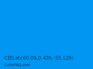 CIELab 60.09,0.439,-55.129 Color is a normal blue color and the nearest color is Vivid Cerulean #00aaee. Hex code #0096f2 and RGB value is rgb(0,150,242). In RGB color space, this color is composed of 0% red, 59% green, 95% blue, In CMYK color space, this color is composed of 100% cyan, 38% magenta, 0% yellow , 5% black , In HSL color space, this color has a hue angle of 203° , 100% saturation and 47% lightness.