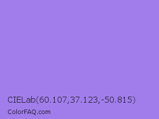 CIELab 60.107,37.123,-50.815 Color is a light indigo color and the nearest color is Medium Purple #9370db. Hex code #a17deb and RGB value is rgb(161,125,235). In RGB color space, this color is composed of 63% red, 49% green, 92% blue, In CMYK color space, this color is composed of 31% cyan, 47% magenta, 0% yellow , 8% black , In HSL color space, this color has a hue angle of 260° , 73% saturation and 71% lightness.