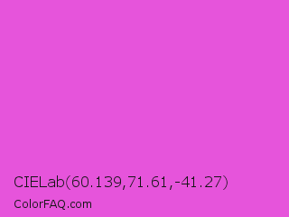 CIELab 60.139,71.61,-41.27 Color is a light magenta color and the nearest color is Purple Pizzazz #fe4eda. Hex code #e654db and RGB value is rgb(230,84,219). In RGB color space, this color is composed of 90% red, 33% green, 86% blue, In CMYK color space, this color is composed of 0% cyan, 63% magenta, 5% yellow , 10% black , In HSL color space, this color has a hue angle of 305° , 74% saturation and 62% lightness.