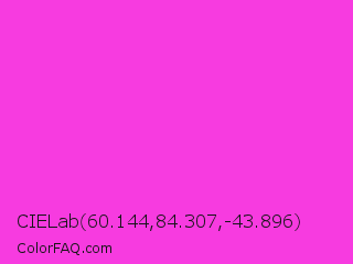 CIELab 60.144,84.307,-43.896 Color is a normal magenta color and the nearest color is Purple Pizzazz #fe4eda. Hex code #f73be0 and RGB value is rgb(247,59,224). In RGB color space, this color is composed of 97% red, 23% green, 88% blue, In CMYK color space, this color is composed of 0% cyan, 76% magenta, 9% yellow , 3% black , In HSL color space, this color has a hue angle of 307° , 92% saturation and 60% lightness.