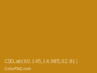 CIELab 60.145,14.985,62.81 Color is a normal orange color and the nearest color is Dark Goldenrod #b8860b. Hex code #c28511 and RGB value is rgb(194,133,17). In RGB color space, this color is composed of 76% red, 52% green, 7% blue, In CMYK color space, this color is composed of 0% cyan, 31% magenta, 91% yellow , 24% black , In HSL color space, this color has a hue angle of 39° , 84% saturation and 41% lightness.