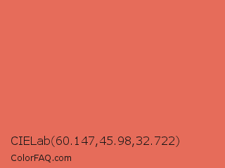 CIELab 60.147,45.98,32.722 Color is a light red color and the nearest color is Terracotta #e2725b. Hex code #e66c5a and RGB value is rgb(230,108,90). In RGB color space, this color is composed of 90% red, 42% green, 35% blue, In CMYK color space, this color is composed of 0% cyan, 53% magenta, 61% yellow , 10% black , In HSL color space, this color has a hue angle of 8° , 74% saturation and 63% lightness.