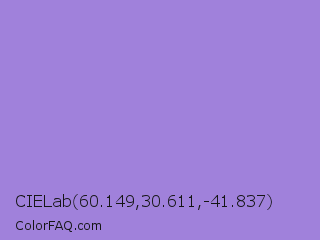 CIELab 60.149,30.611,-41.837 Color is a light violet color and the nearest color is Lilac Bush #9874d3. Hex code #a081db and RGB value is rgb(160,129,219). In RGB color space, this color is composed of 63% red, 51% green, 86% blue, In CMYK color space, this color is composed of 27% cyan, 41% magenta, 0% yellow , 14% black , In HSL color space, this color has a hue angle of 261° , 56% saturation and 68% lightness.