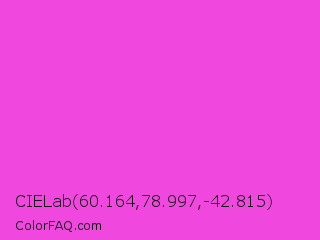 CIELab 60.164,78.997,-42.815 Color is a light magenta color and the nearest color is Purple Pizzazz #fe4eda. Hex code #f047de and RGB value is rgb(240,71,222). In RGB color space, this color is composed of 94% red, 28% green, 87% blue, In CMYK color space, this color is composed of 0% cyan, 70% magenta, 8% yellow , 6% black , In HSL color space, this color has a hue angle of 306° , 85% saturation and 61% lightness.